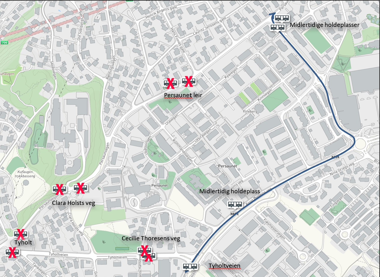 På grunn av veiarbeid stenges holdeplassen Rønningsbakken retning sentrum.