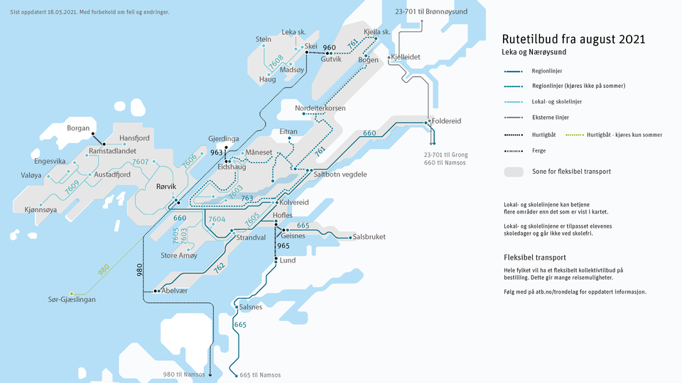 Route information for bus, flexible transport and boat in Leka and Nærøysund.