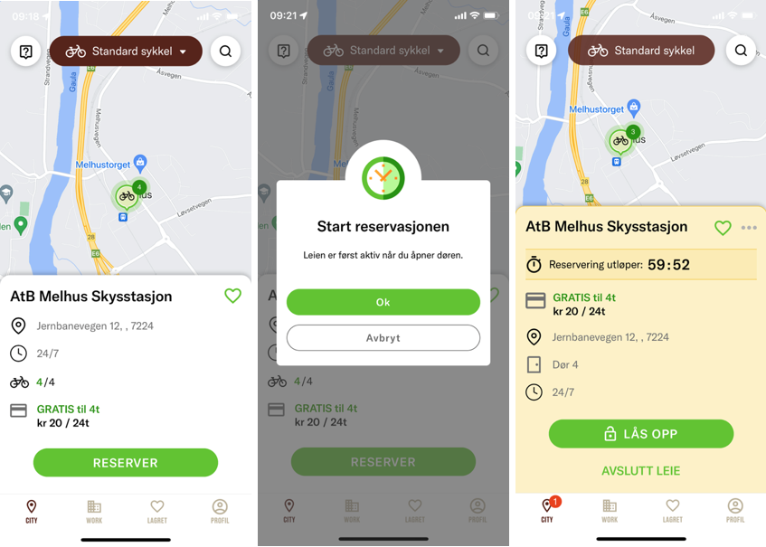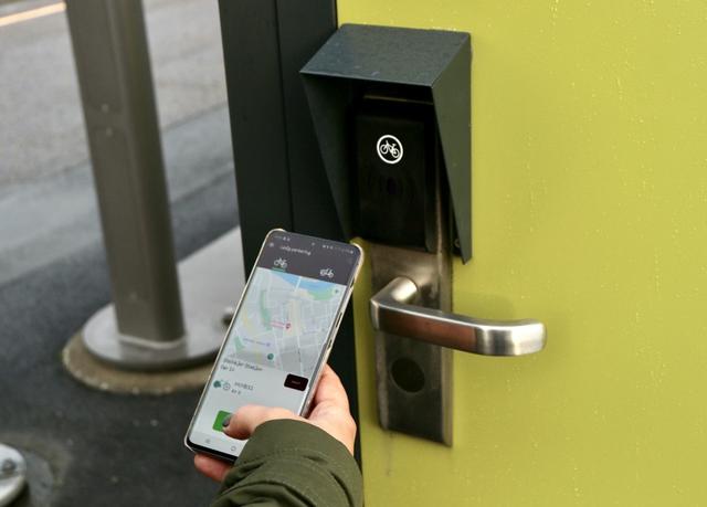 Åpne døra ved hjelp av appen, ta ut sykkelen og lukk døra ordentlig. Avslutt parkeringen i appen.