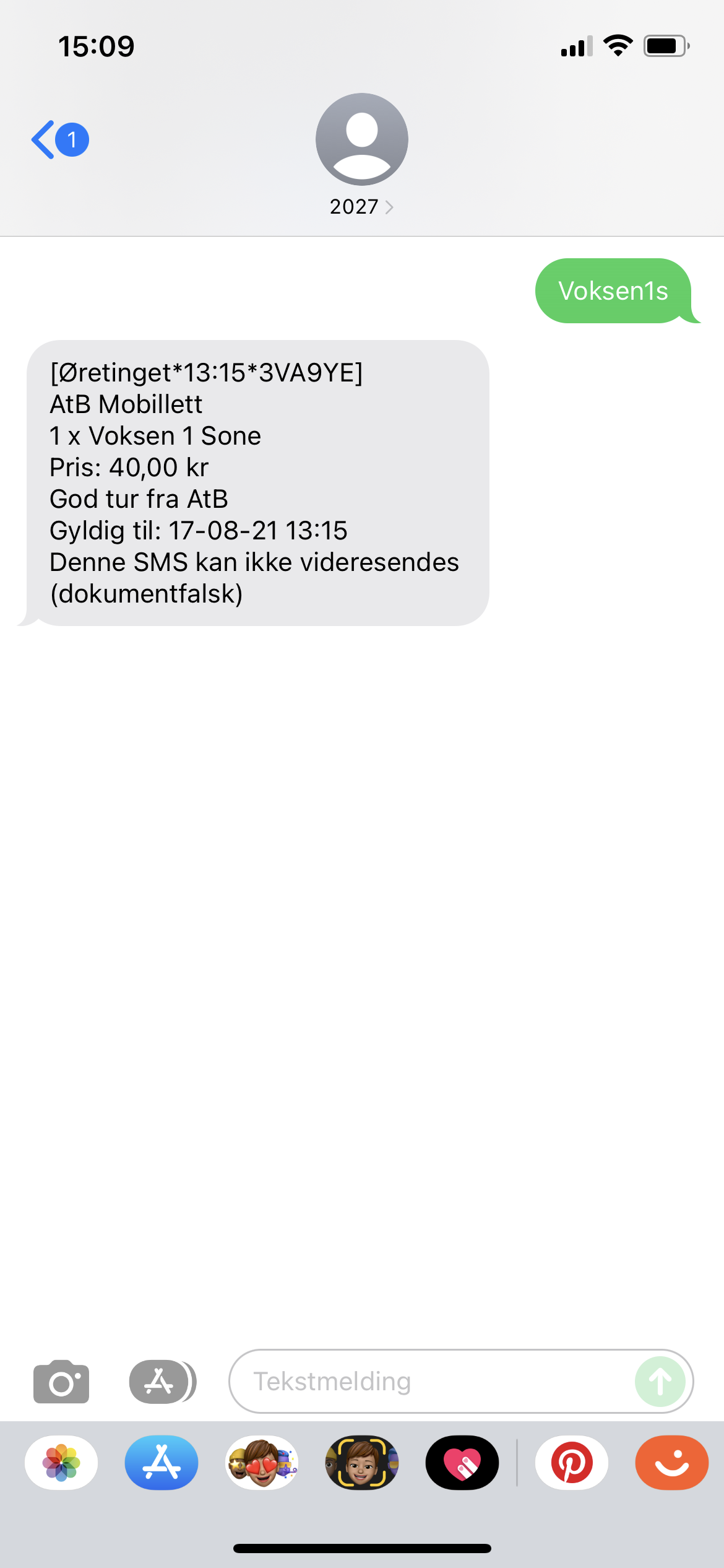 Slik ser en gyldig SMS-billett ut: