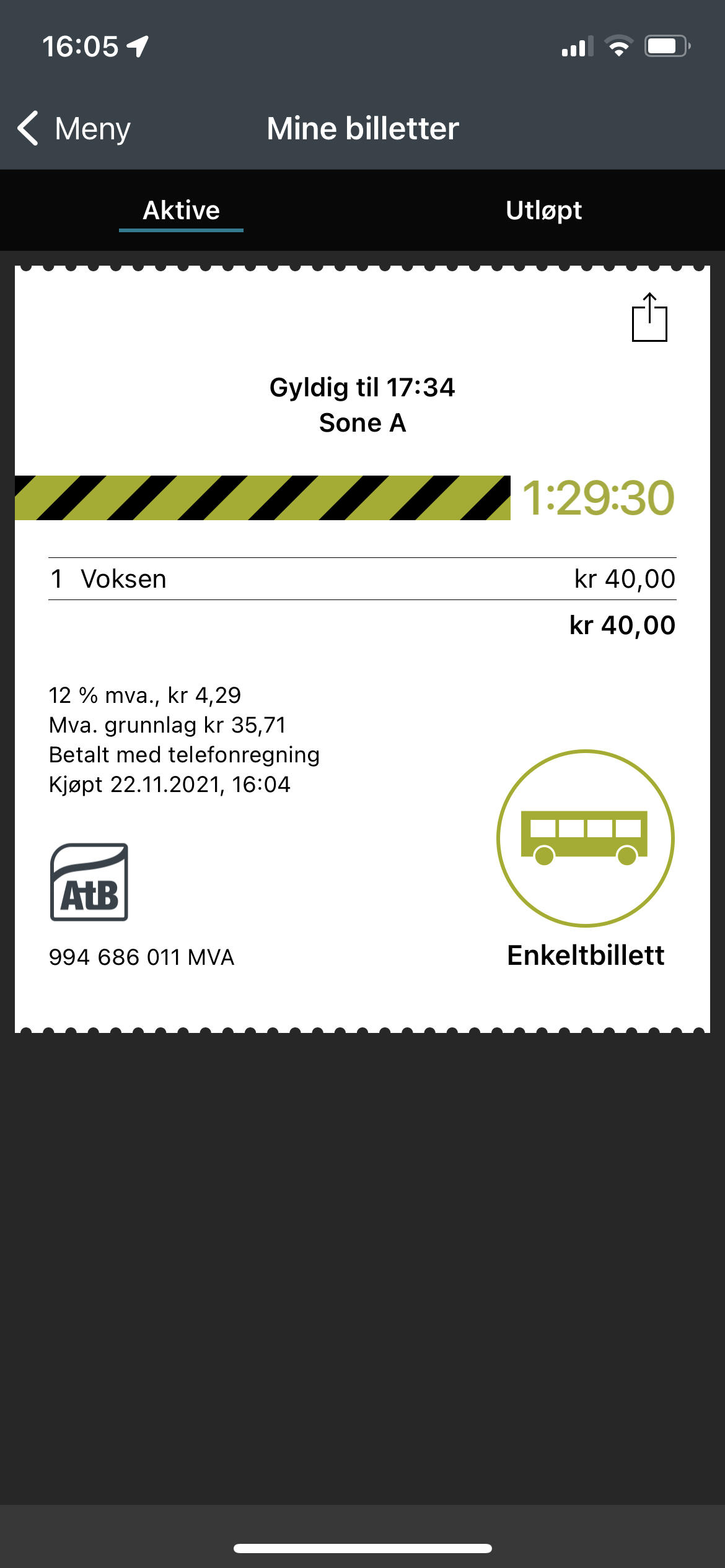 Slik ser en gyldig billett ut i AtB-appen: