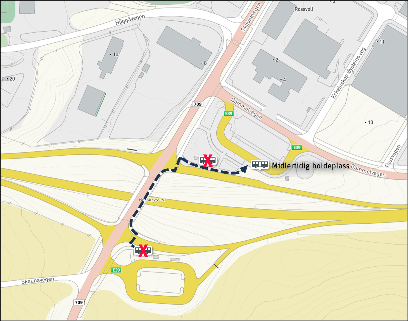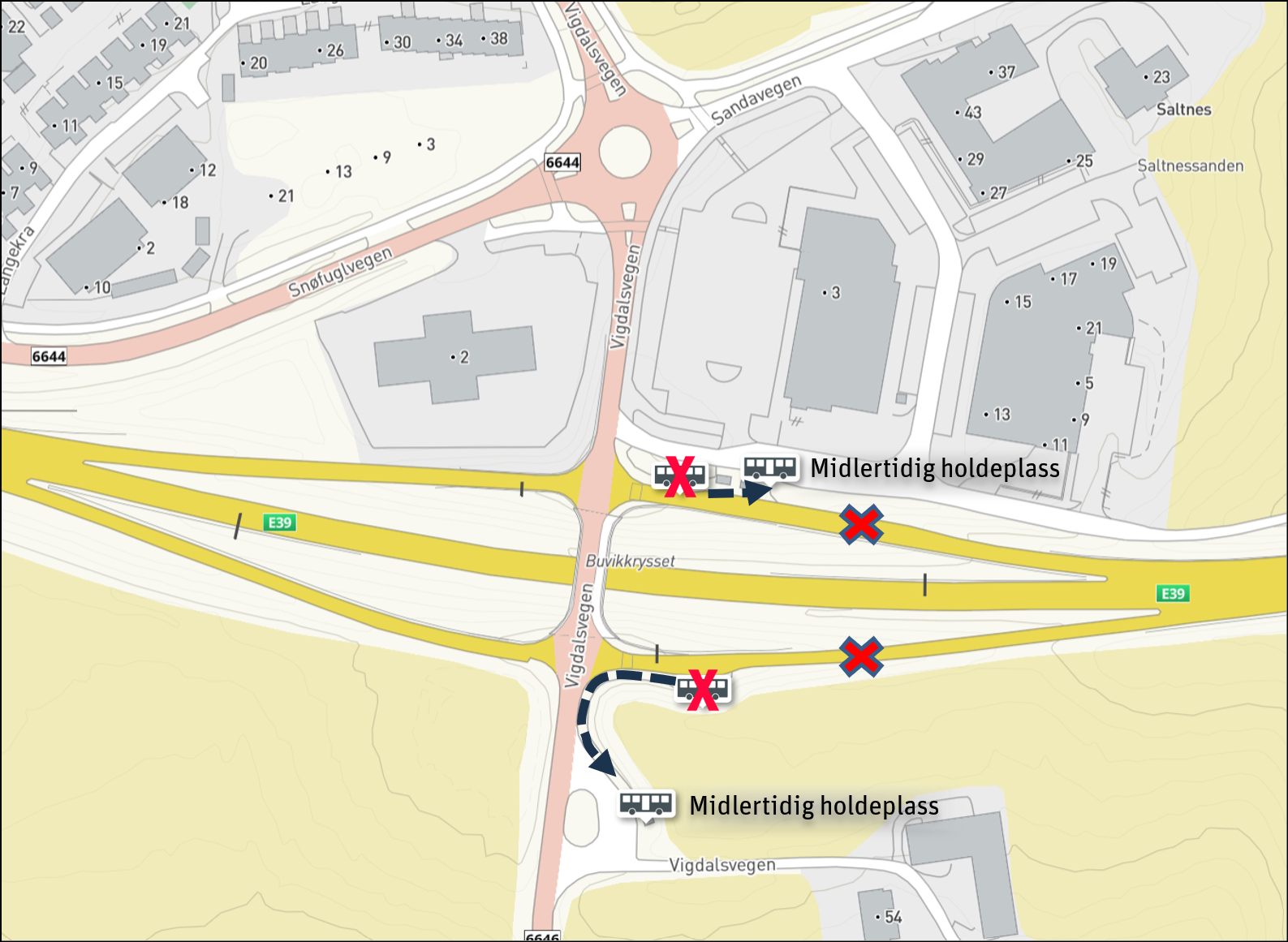 Buvikkrysset: Når E39 stenges mellom Buvika og Øysand benyttes følgende holdeplasser. Ved stenging i retning Børsa benyttes de vanlige holdeplassene.