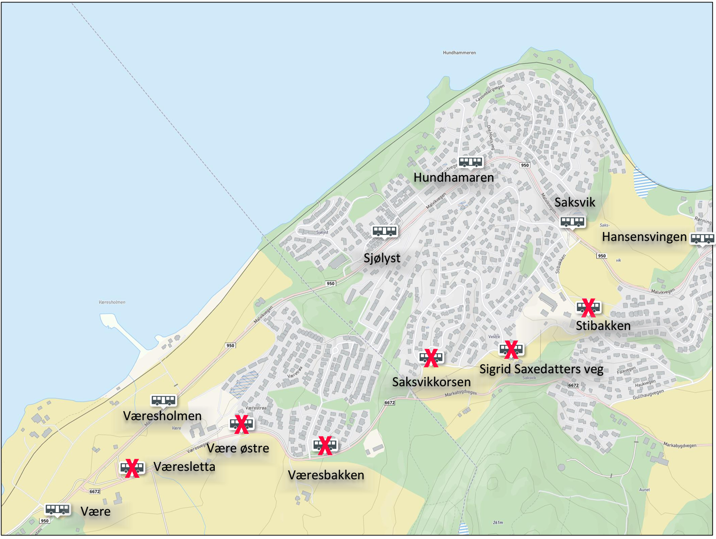 Disse holdeplassene mellom Være og Hansensvingen betjenes ikke i perioden: