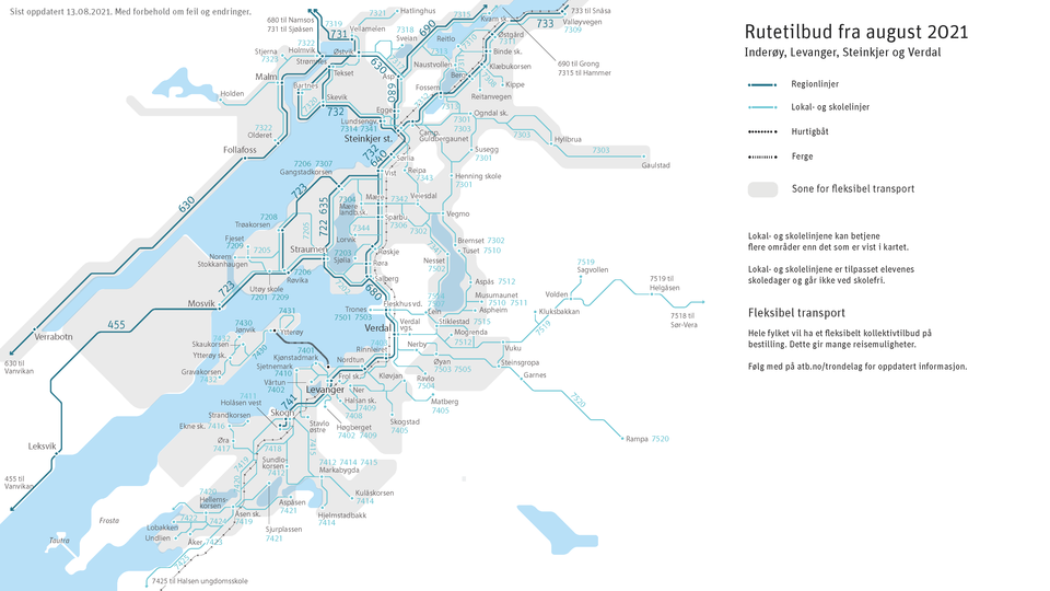 Innherred Route information for bus, flexible transport, train and boat in Inderøy, Levanger, Steinkjer and Verdal. Click the map to open pdf in a new tab. Find your trip Use the app AtB or travel planner to find your trip from A to B. Inderøy Levanger Steinkjer Verdal
