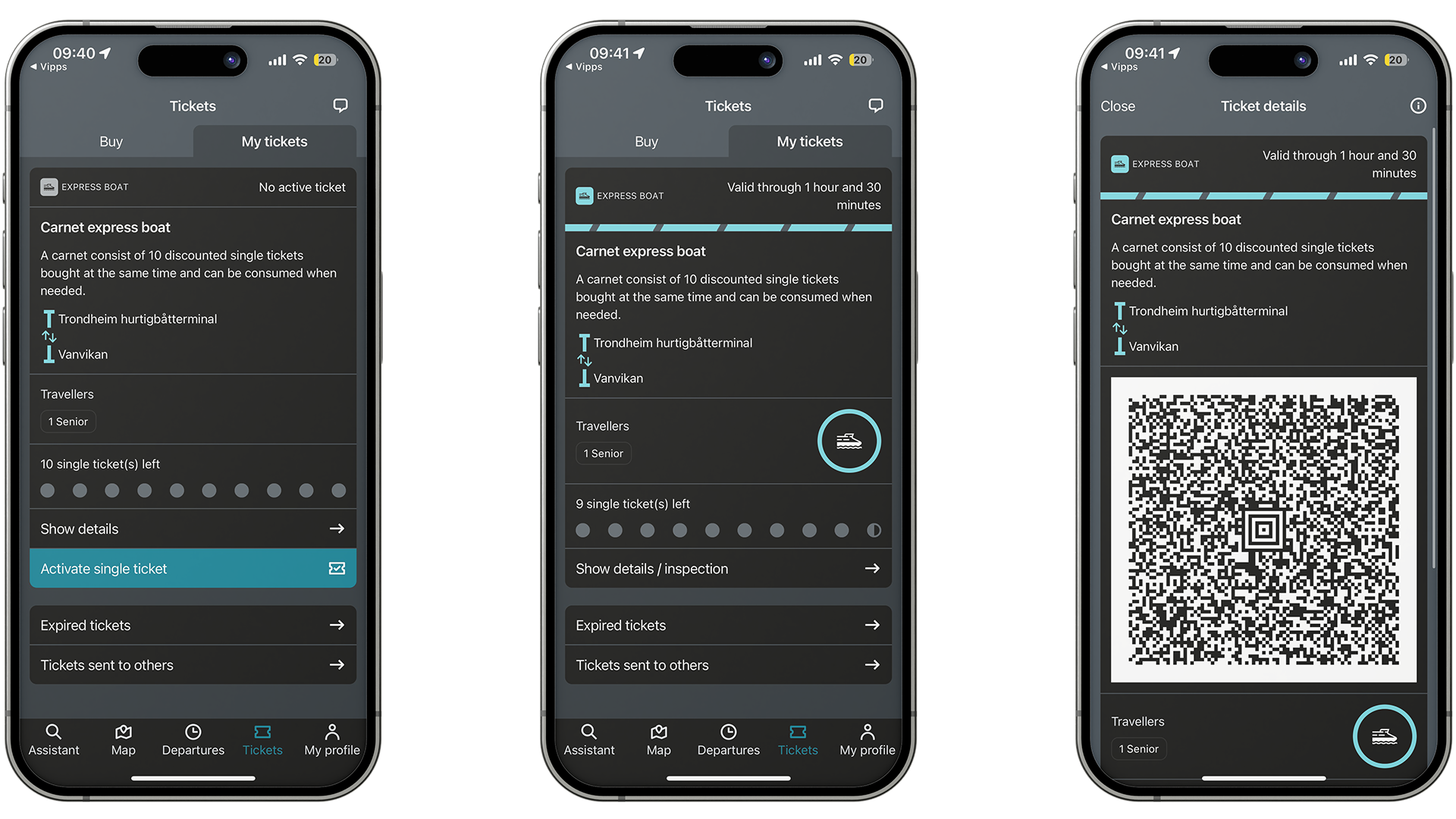 Når du aktiverer en billett, er den ikke retningsbestemt, men gjelder for én båtstrekning. For eksempel: Trondheim-Vanvikan/Vanvikan-Trondheim.
