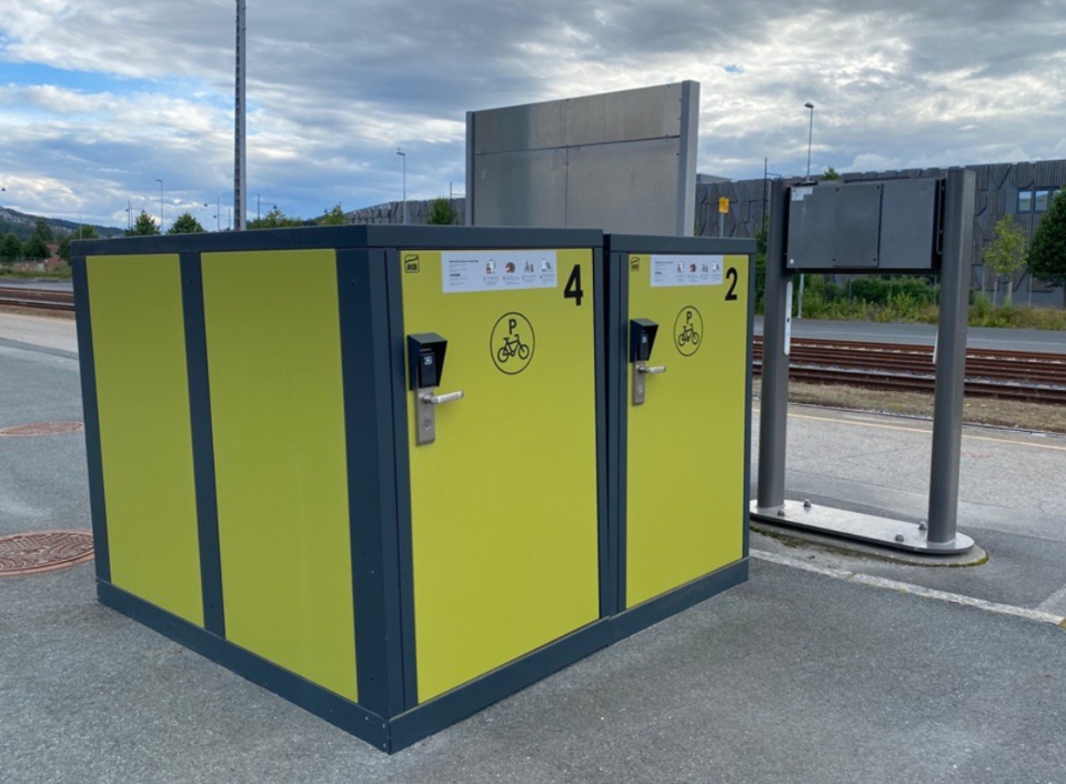 På Steinkjer stasjon finner du fire plasser i sykkelskap. Her kan du parkere trygt når du skal på jobb eller gjøre ærend i sentrum, reise med tog eller buss.