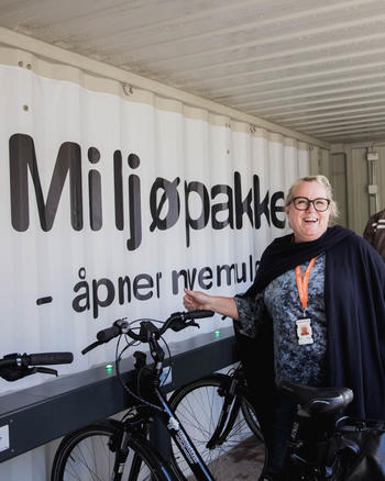 Bildetekst: Elsykkelcontaineren er på plass hos Multiconsult. De ansatte skal få se om elsykling kan være en fin erstatning for bilen til og fra jobb.