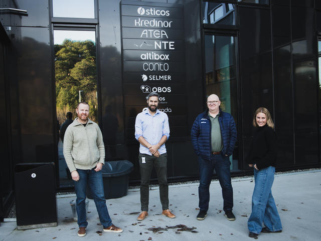 ATTRAKTIVT: Sticos tok selv kontakt for å bli med i HjemJobbHjem og tror at fordelene blir tatt godt imot av bedriftens ansatte. (f.v.) Hans Olav Sekkeseter, Espen Sjøvoll, Erik Jullumstrø (HR-sjef og kontaktperson for HJH) og Kristin Girske Lauritsen (Mobilitetsrådgiver i Miljøpakken).
