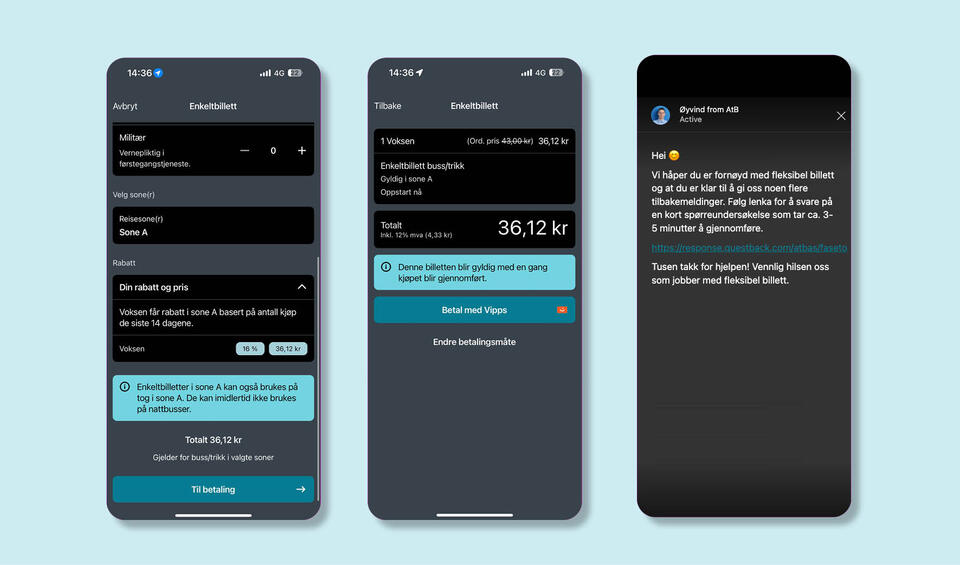 Mål: Kartlegge behovene til kunder som ikke reiser like hyppig med AtB og som opplever at dagens billetter ikke passer deres reisehverdag. Vi tester en ny type fleksibel billett med rabattløsning for å se om dette kan dekke kundens behov og samtidig motivere til flere kollektivreiser.